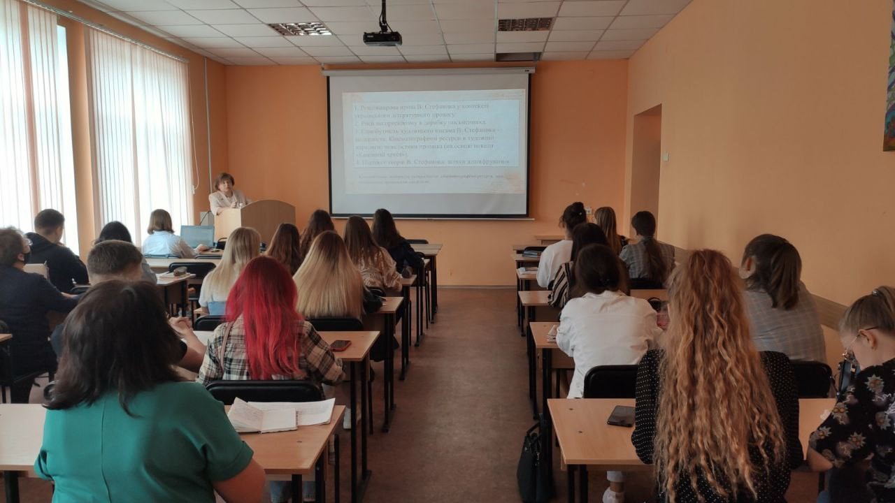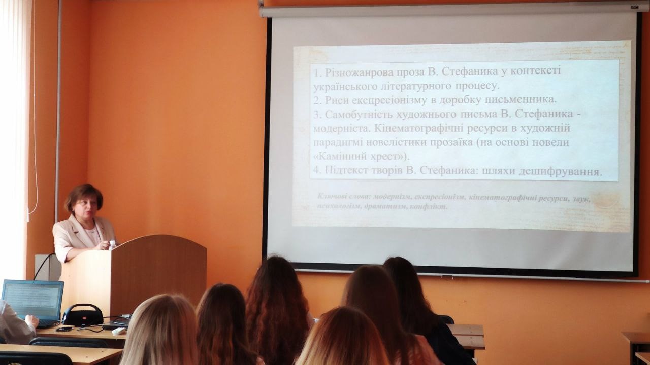 Українська мова і література». На лекції було розглянуто різножанрову прозу В. Стефаника в контексті українського літературного процесу кінця ХІХ – початку ХХ ст., означені риси експресіонізму у доробку письменника. Своєрідність індивідуальної манери письма В. Стефаника лекторка розкрила за допомогою міжмистецького підходу, залучаючи до викладового матеріалу кінематографічні прийоми та кіноматеріали. Проф. Горболіс Л. М. запропонувала авторський підхід до інтерпретації творів прозаїка-покутянина.