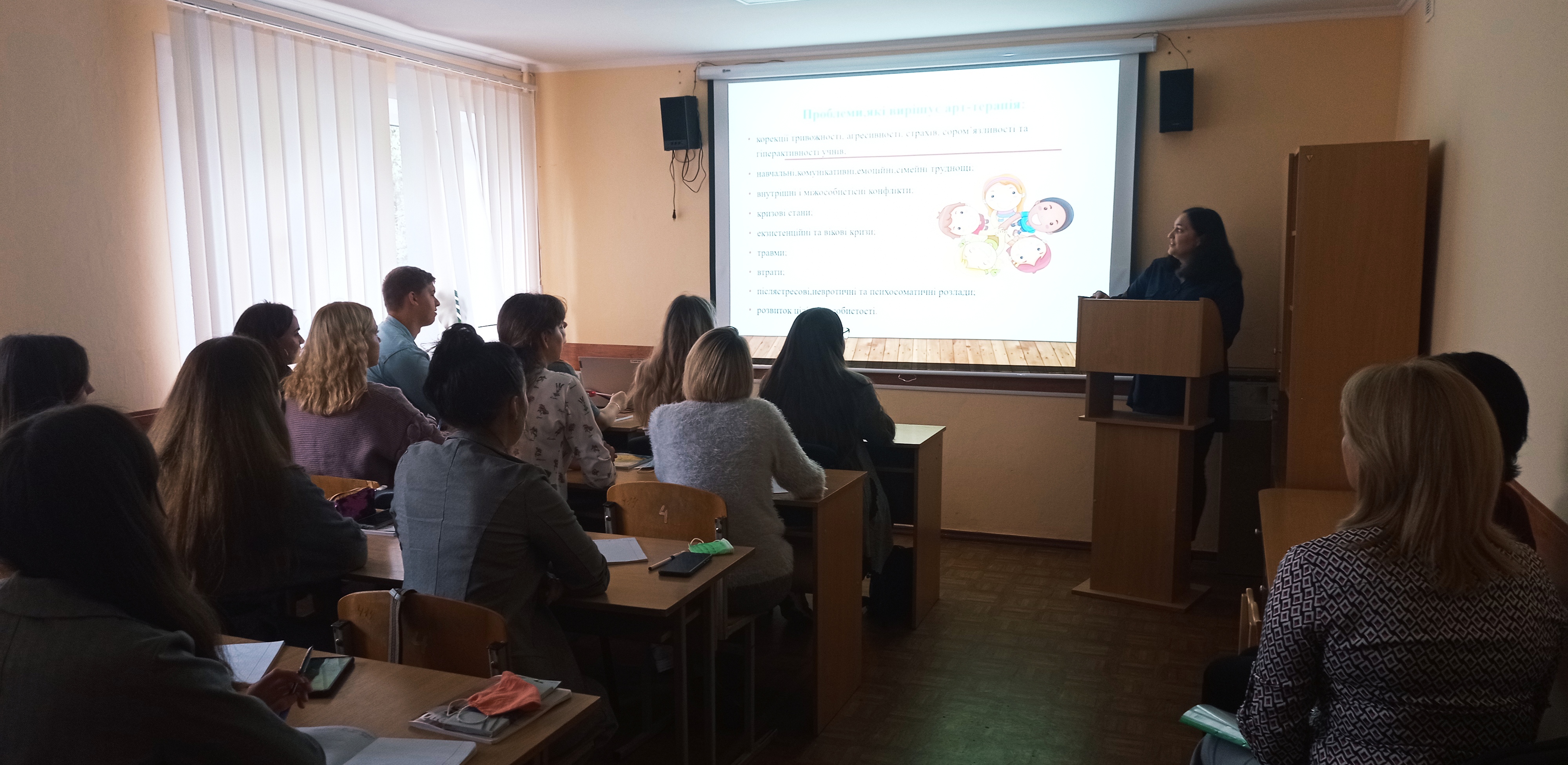 Студентам-другокурсникам представлено теоретичний та практичний матеріал для засвоєння майбутніми фахівцями знань, умінь та навичок використання засобів мистецтва на корекційних заняттях із дітьми з особливими освітніми потребами. Разом зі студентами було відпрацьовано техніку «Груповий малюнок» для визначення особливостей мікроклімату у колективі.