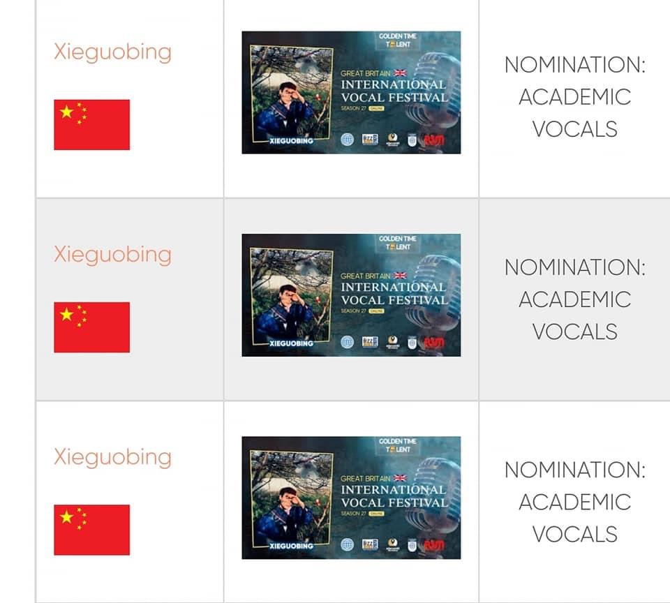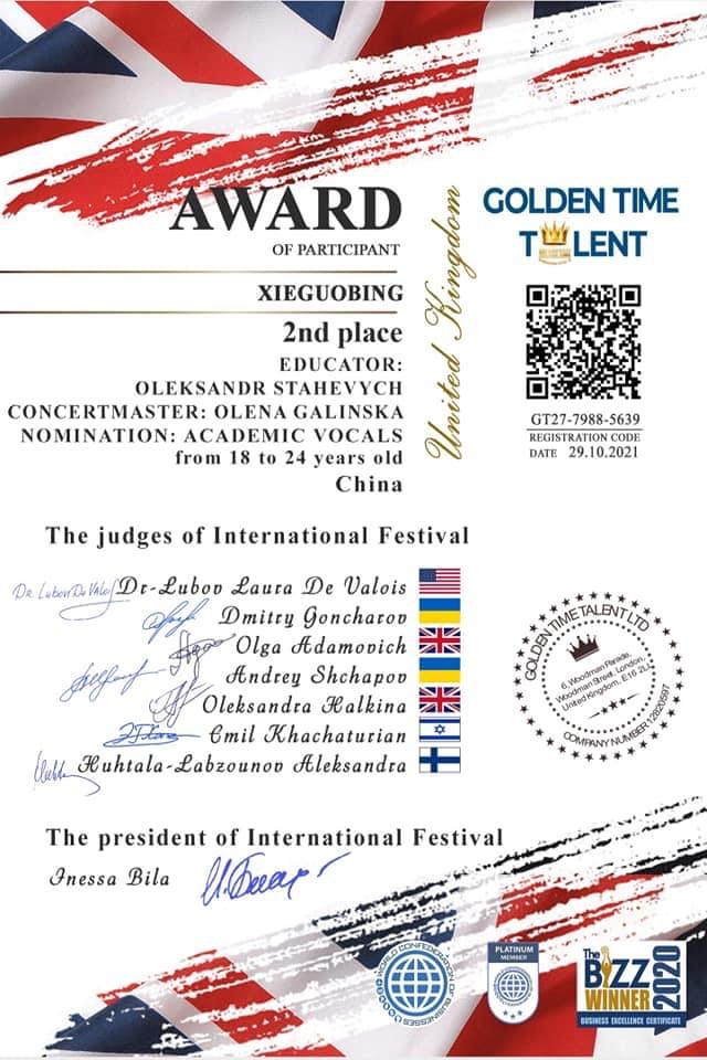 Навчально-науковий інститут культури і мистецтв вітає Се Гобін, магістранта спеціальності 025 Музичне мистецтво з перемогою у Міжнародному вокальному фестивалі-конкурсі, що проводився на платформі GOLDEN TIME TALANT та викладача кафедри хорового диригування, вокалу та методики музичного навчання, доктора мистецтвознавства, професора Стахевича О. Г. та провідного концертмейстера Галінську О. Я.