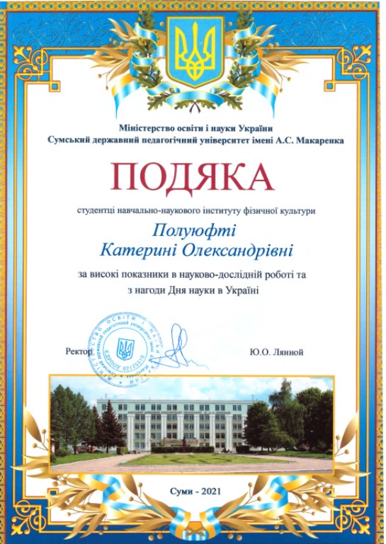 Вітаємо студентку ІV курсу спеціальності Спеціальна освіта (Логопедія. Спеціальна психологія) Навчально-наукового інституту фізичної культури Полуюфту Катерину Олександрівну з отриманням подяки за високі показники в науково-дослідній роботі та з нагоди Дня Науки в Україні від Ректора Сумського державного педагогічного університету імені А. С. Макаренка проф. Юрія Олеговича Лянного.