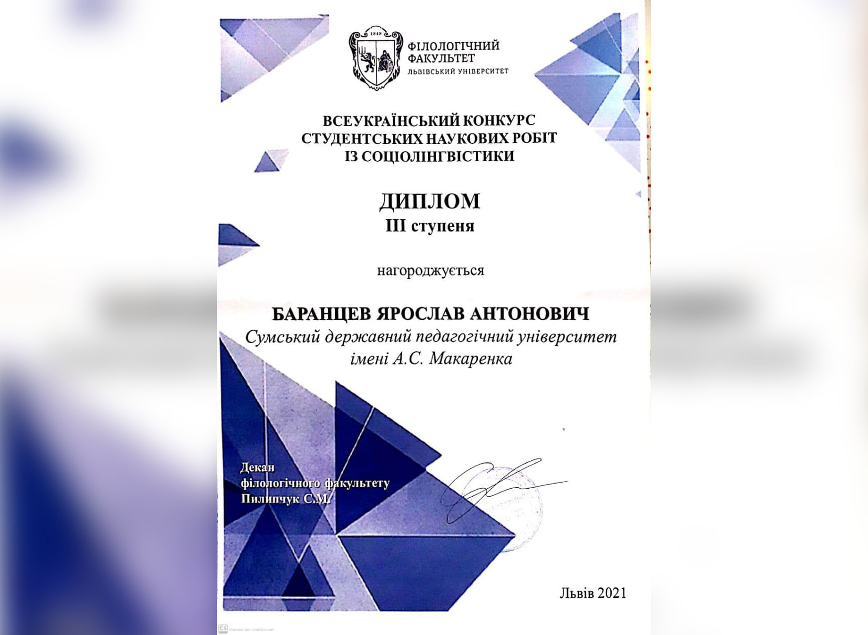 Ресурсний центр вивчення французької мови вітає студента третього курсу Баранцева Ярослава (спеціальність французька мова) з перемогою на Всеукраїнському конкурсі студентських наукових робіт із соціолінгвістики.