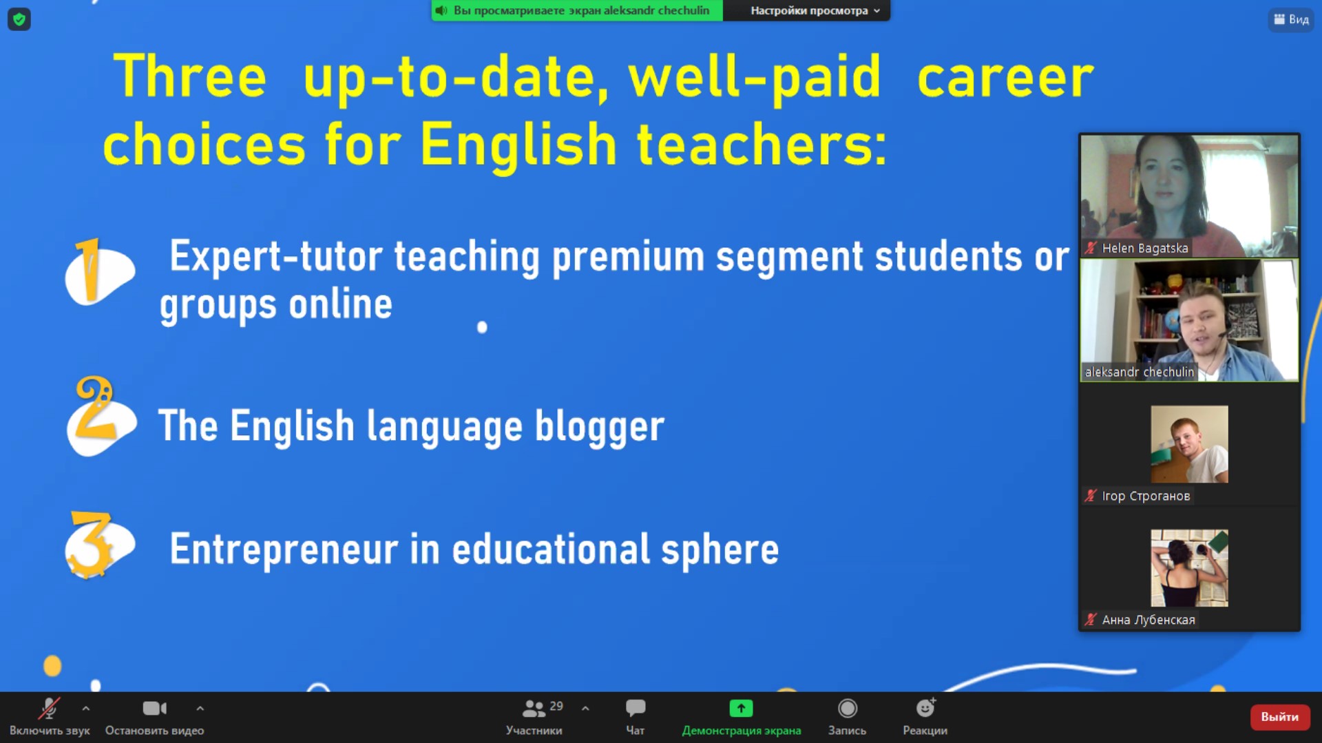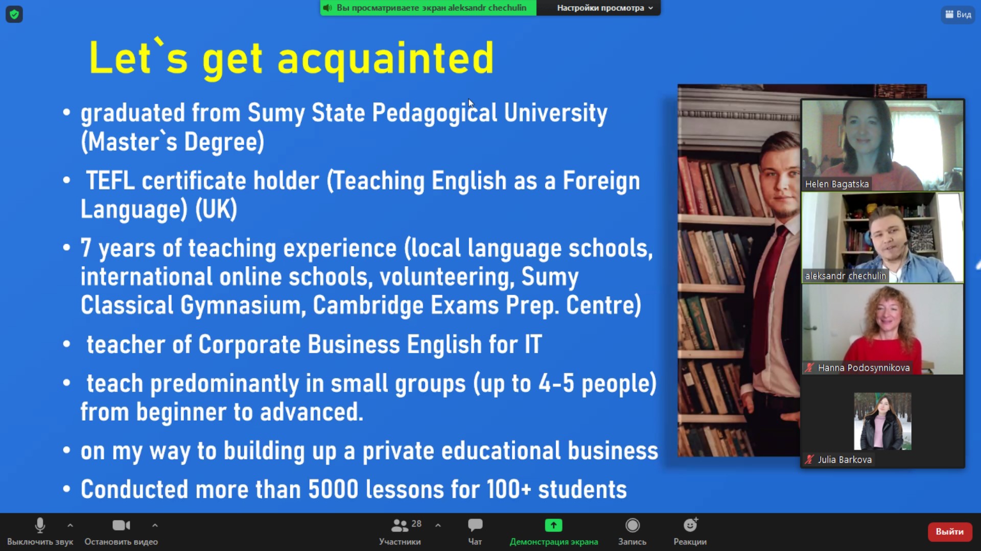 29.09.2021 на кафедрі англійської філології та лінгводидактики факультету іноземної та слов’янської філології Сумського державного педагогічного університету імені А.С. Макаренка відбувся онлайн майстер-клас "Business Side Of Being a Teacher: three up-to-day professional paths" нашого випускника-магістра, вчителя англійської мови Олександра Чечуліна.