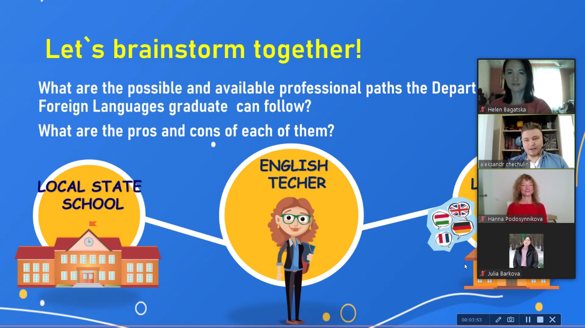 Проведення заходу було організувано Міжуніверситетською науково-дослідною лабораторією сучасних технологій навчання іноземних мов і культур (керівник – доцент Г.І.Подосиннікова). До вебінару долучилися студенти старших курсів і магістранти спеціальності 014 Освіта (Англійська мова та друга іноземна), а також провідні викладачі кафедри англійської філології та лінгводидактики – завідувач кафедри В.В.Козлова, доценти Г.І.Подосиннікова, О.В.Багацька та заступник декана факультету доцент Т.М.Буренко.