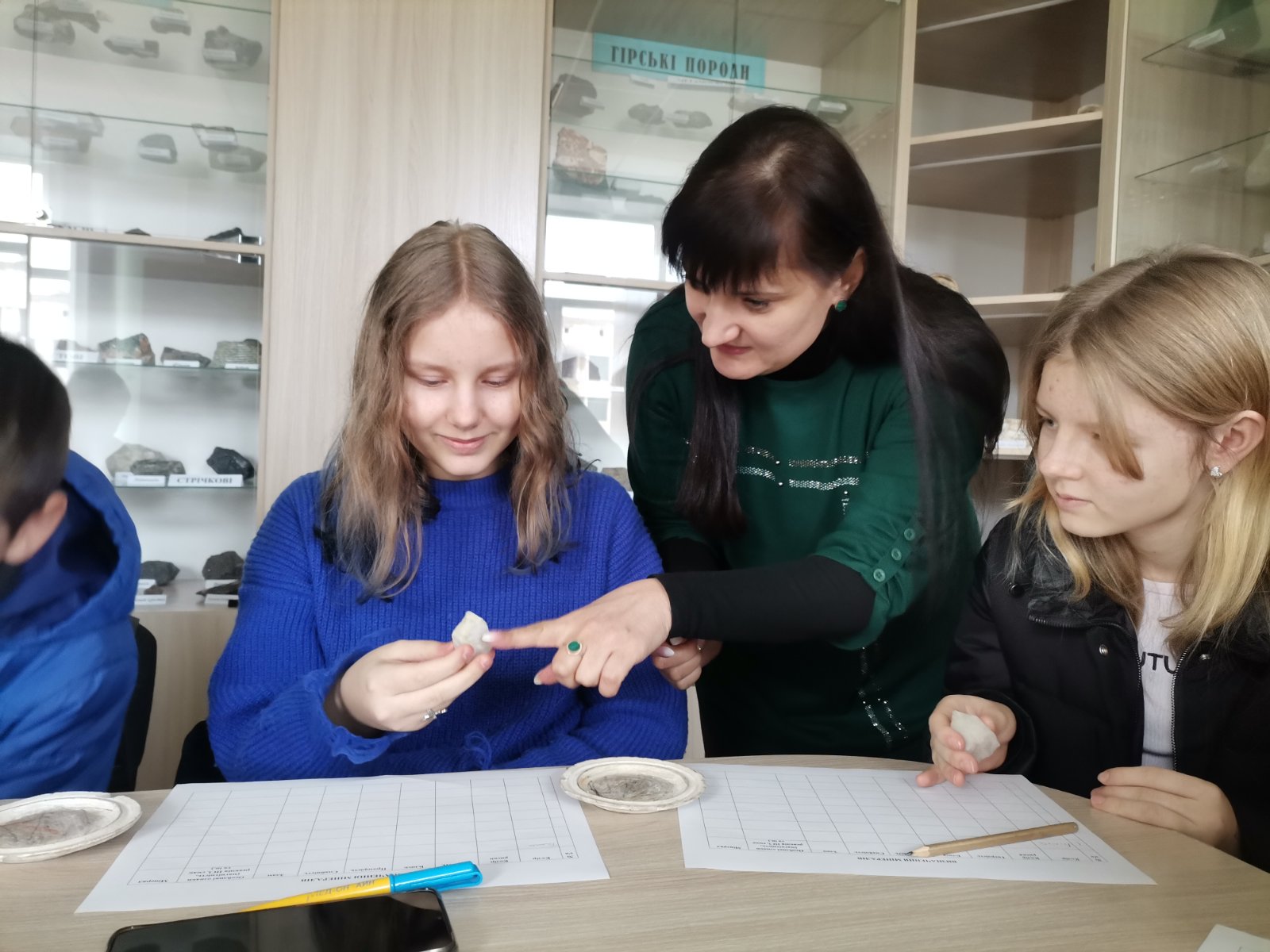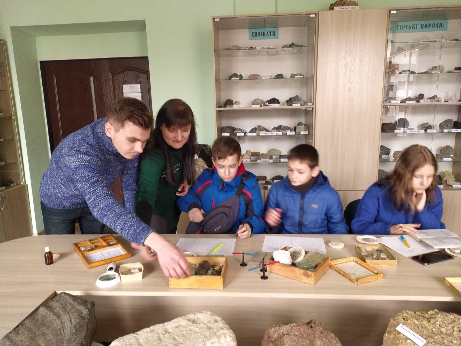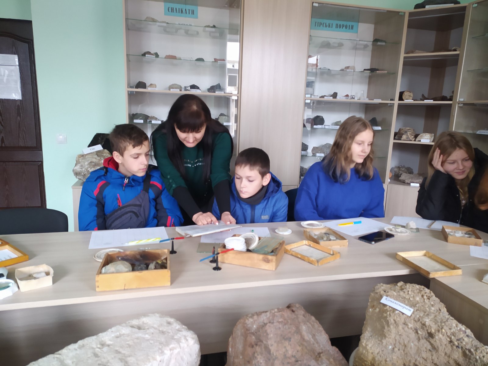 Завідувач музею канд. геогр. наук, доцент Данильченко О.С. провела майстер-клас «Вчимося визначати мінерали». На занятті вихованці згадали фізичні властивості мінералів та їх морфологічні особливості, навчилися визначати колір, колір риски, твердість, блиск, спайність, прозорість, злам мінералів та на основі цих ознак, власне, визначати мінерали. Гуртків з цікавістю поринули у яскравий світ мінералів, отримали позитивні емоції від результату визначення, коли на їх очах нібито звичайні «камінці» перетворилися на квар, гіпс, кальцит, ортоклаз, сірку, флюорит, халькопірит та інші, а також отримали незвичні подарунки-загадки за правильно визначені зразки.