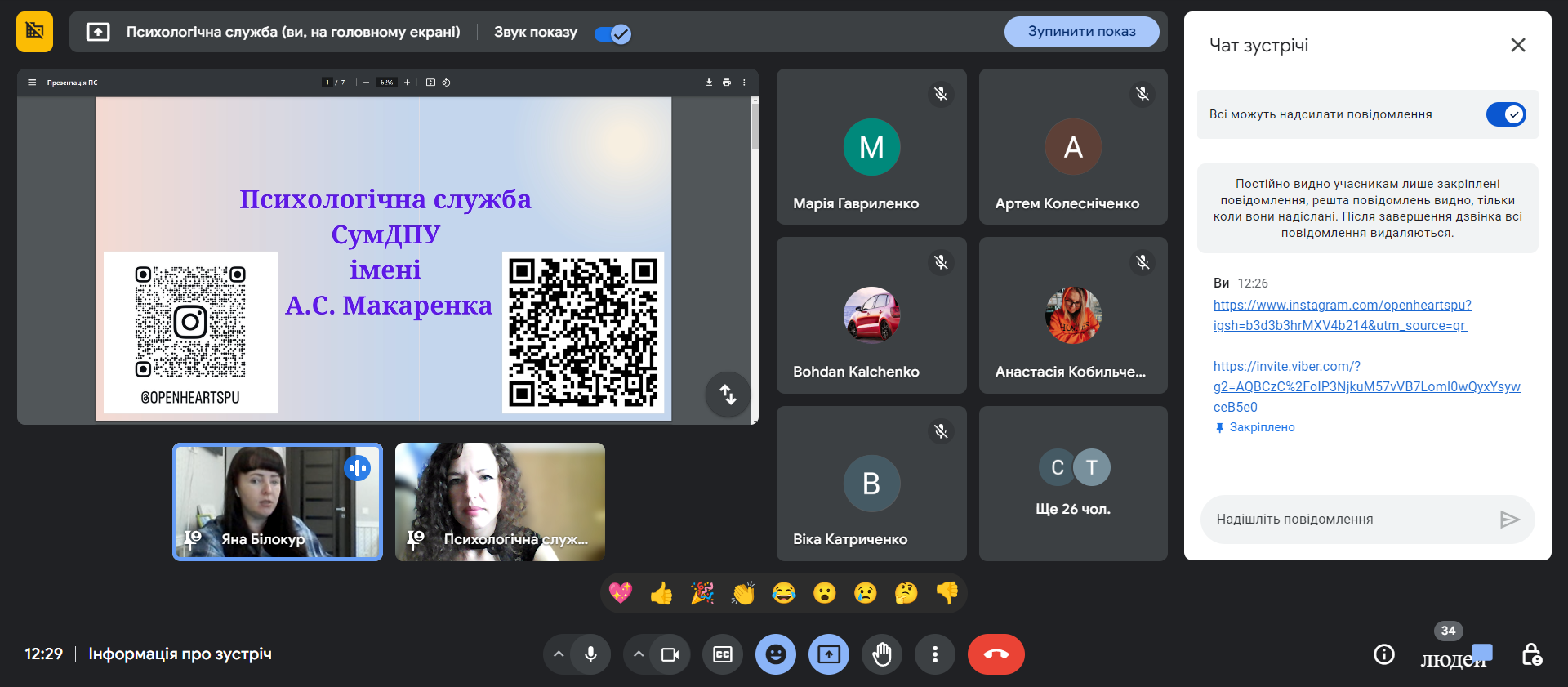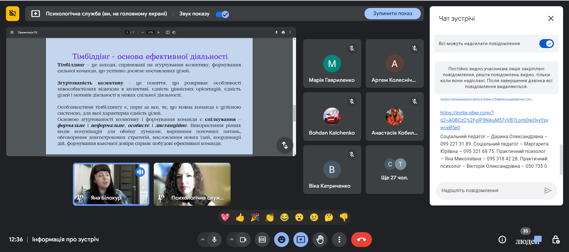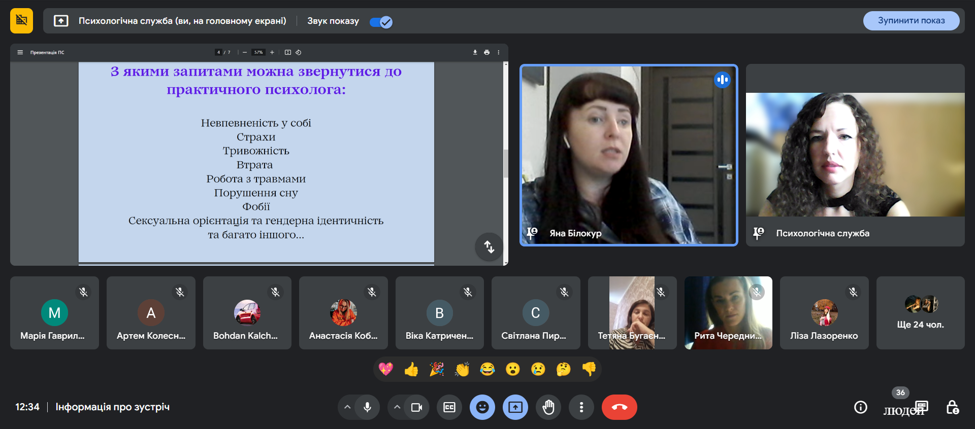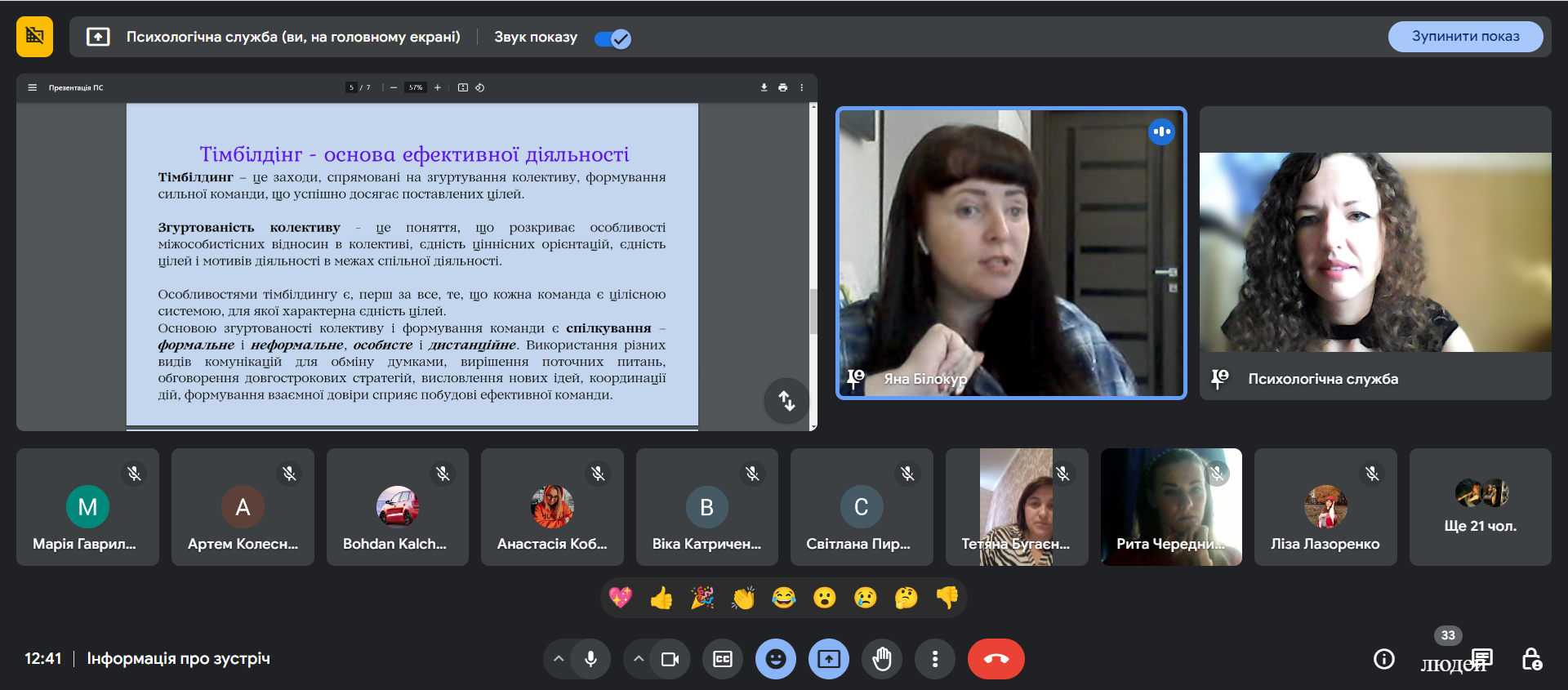 Зі студентами Фізико-математичного факультету було проведено онлайн-захід з елементами тренінгу на тему: «Згуртованість», а з Навчально-науковим інститутом фізичної культури просвітницький захід: «Тімбілдінг – основа ефективної діяльності», де студенти ділились захопленнями, хобі та емоціями, отримуючи рекомендації для кращого знайомства.