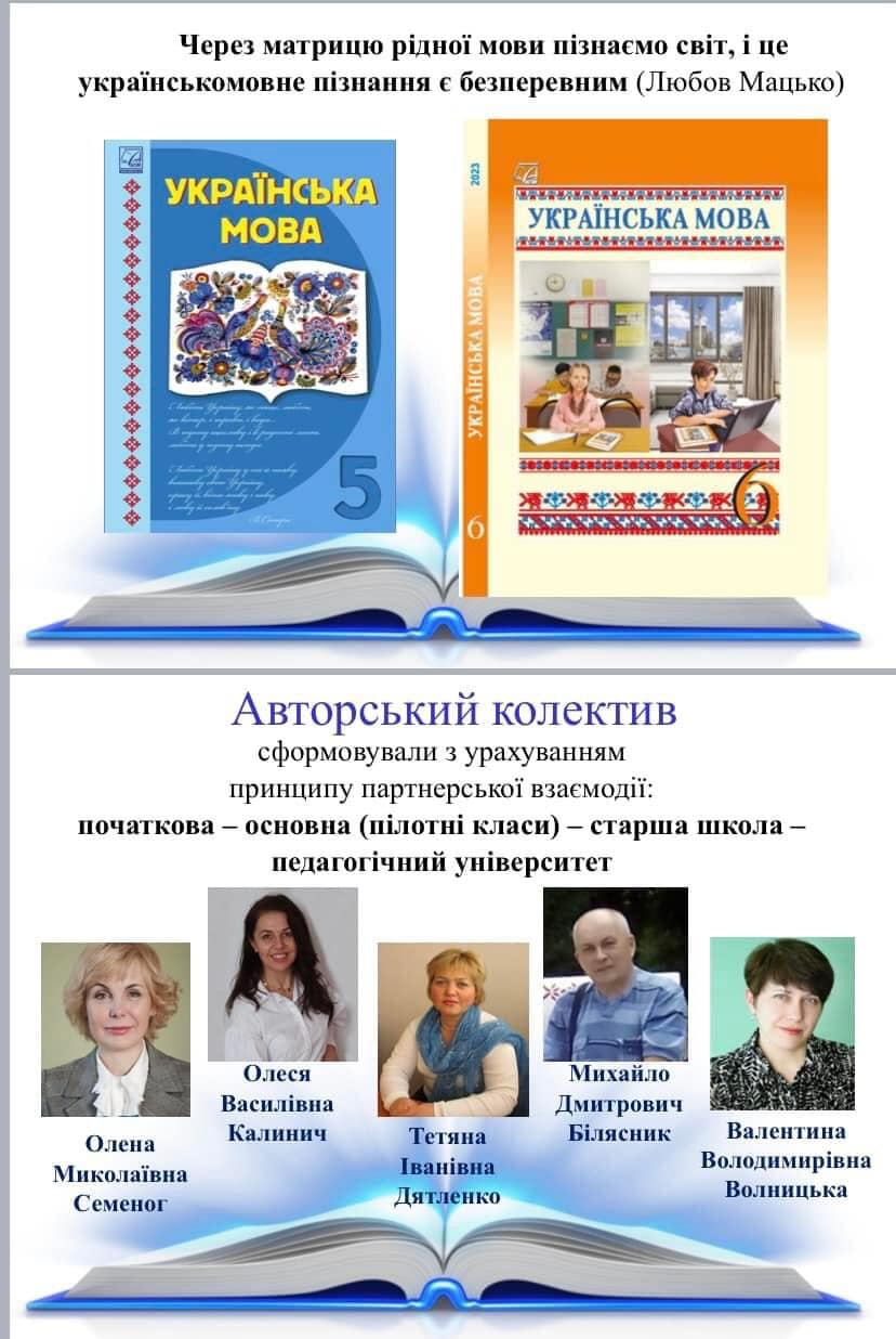 Авторський колектив підручника з української мови для 6 класу (Олена Семеног, Олеся Калинич, Тетяна Дятленко, Михайло Білясник, Валентина Волницька) сформований з урахуванням принципів партнерської взаємодії: початкова ‒ основна (пілотні класи) ‒ старша школа ‒ педагогічний університет. Сам підручник скомпонований таким чином, щоб на уроках української мови розвивати основні компетентності НУШ, зокрема мовну, інформаційно-комунікаційну, громадську та соціальну, культурну. Такий підхід є правильним, адже важливо формувати компетентності не окремо одна від одної, а в сукупності.