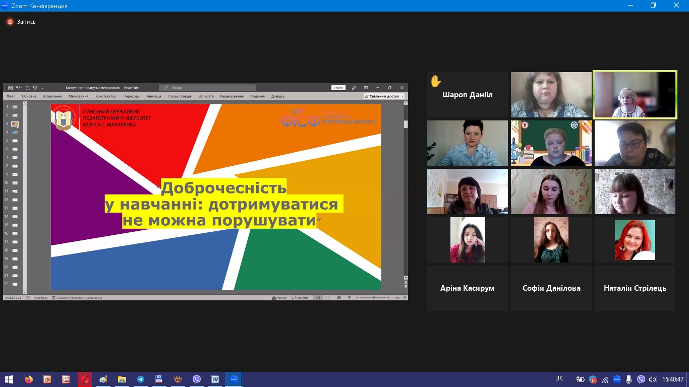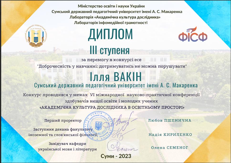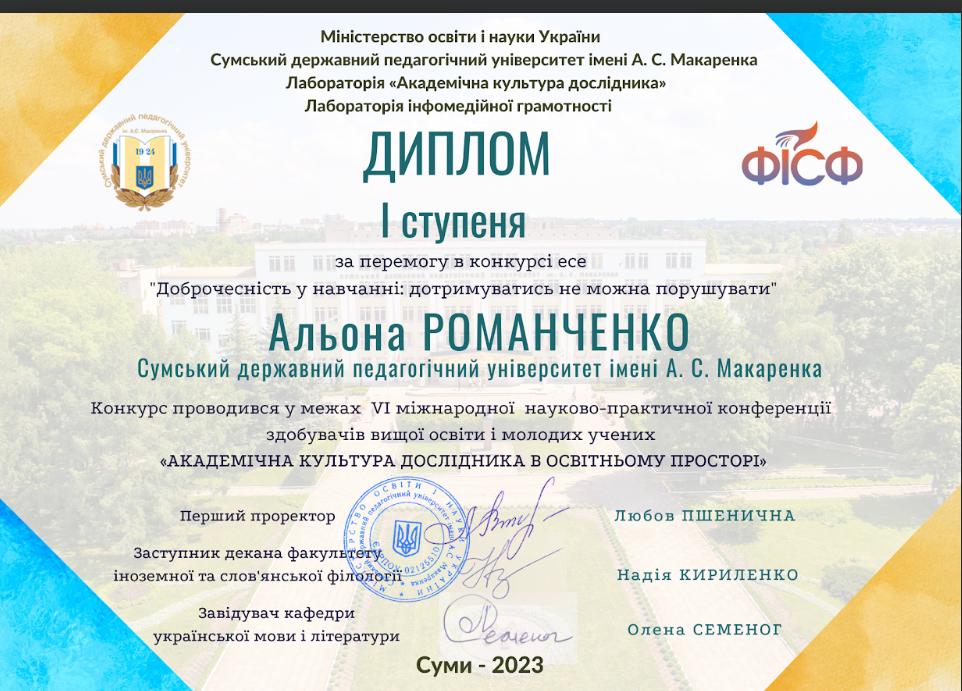 У межах VІ Міжнародної науково-практичній конференції здобувачів вищої освіти і молодих учених «Академічна культура дослідника в освітньому просторі: європейський та національний досвід» (18-19 травня 2023 року) відбувся конкурс есе «Доброчесність у навчанні: дотримуватись не можна порушувати».