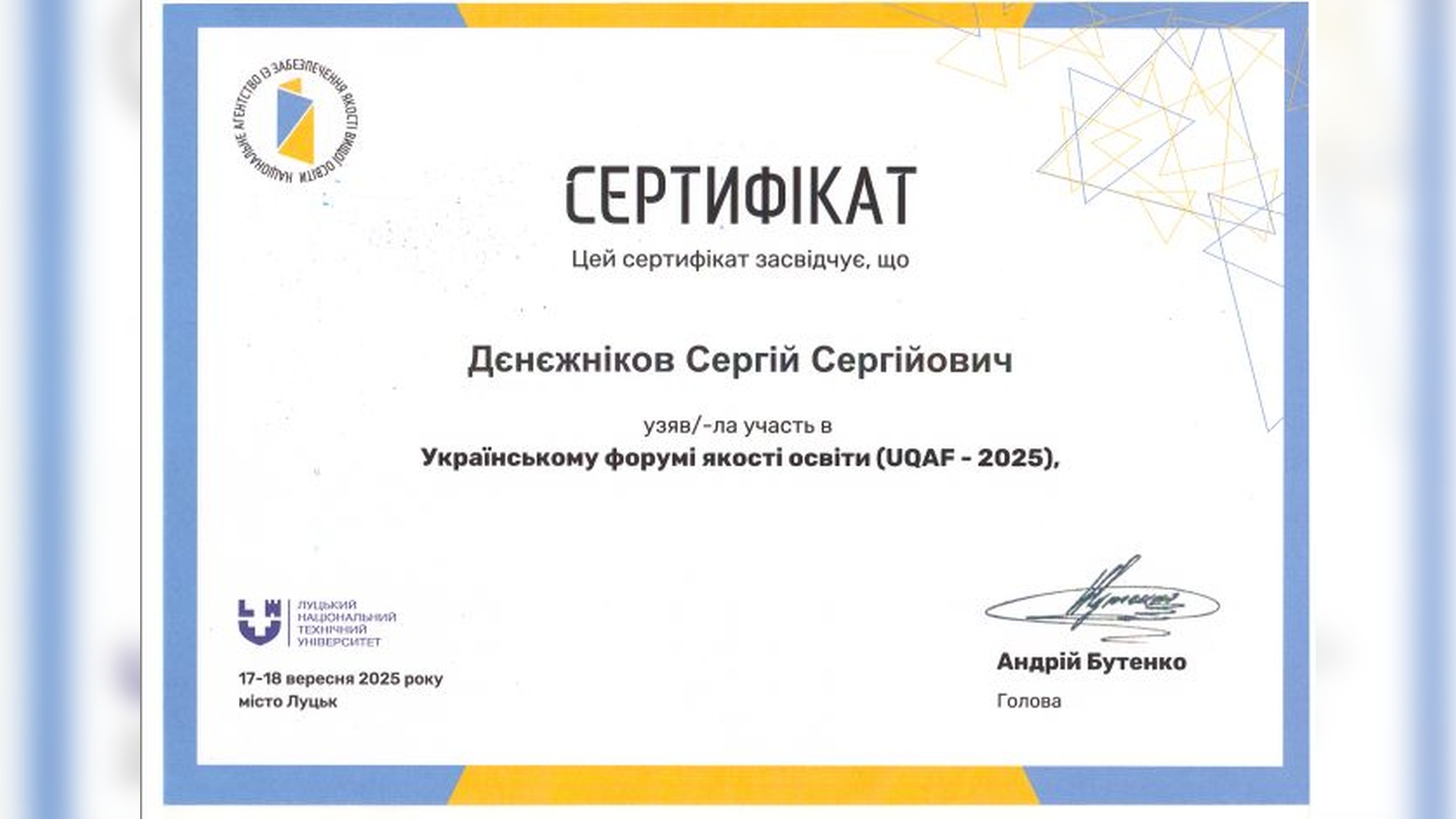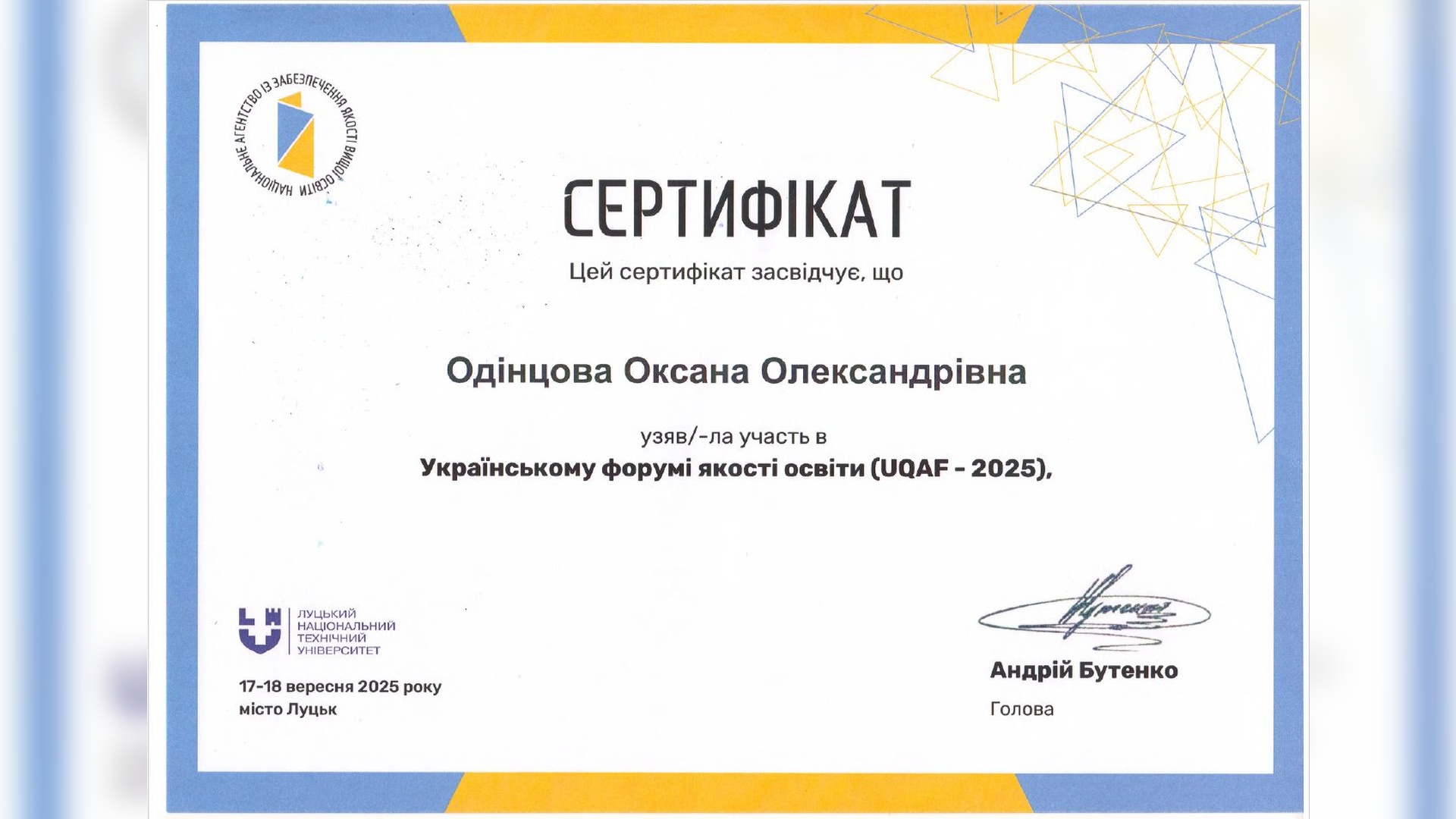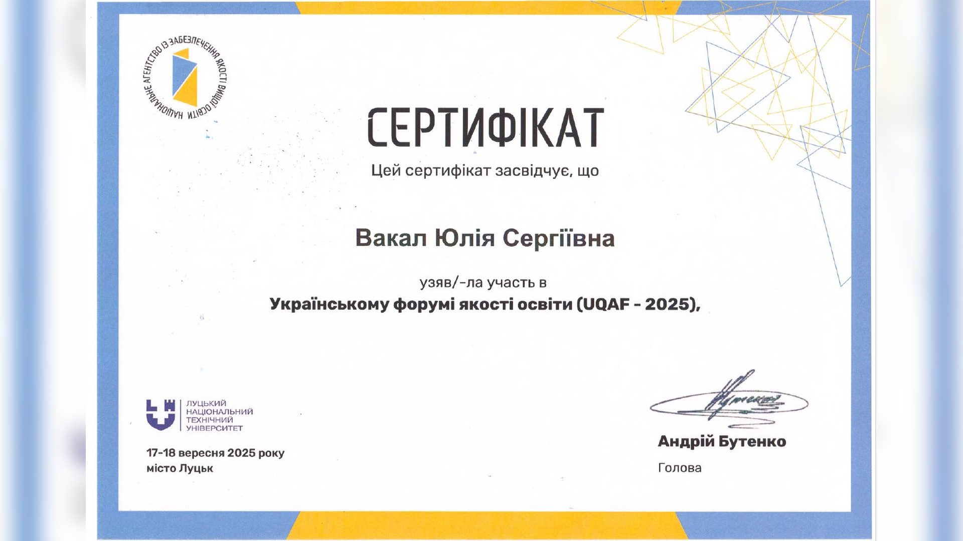 17-18 вересня 2025 року в Луцькому національному технічному університеті відбувся день Українського форуму якості освіти/UQAF–2025, який організувало Національне агентство із забезпечення якості вищої освіти у співпраці з ЛНТУ.