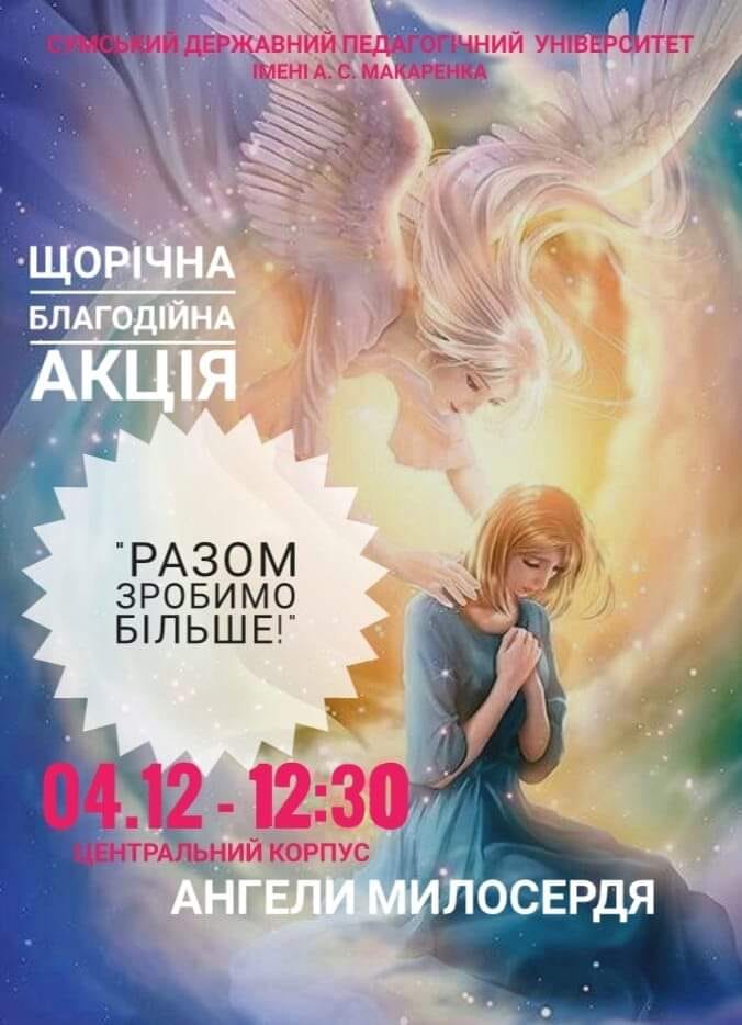4 грудня волонтерським рухом "Крок назустріч" СумДПУ імені А.С. Макаренка, з нагоди Міжнародного дня людей з інвалідністю, було проведено благодійний ярмарок, участь в якому взяли спеціалізовані заклади, організації та волонтери з усієї області.