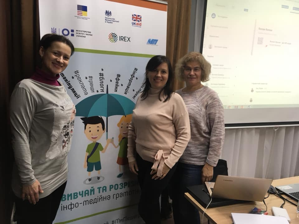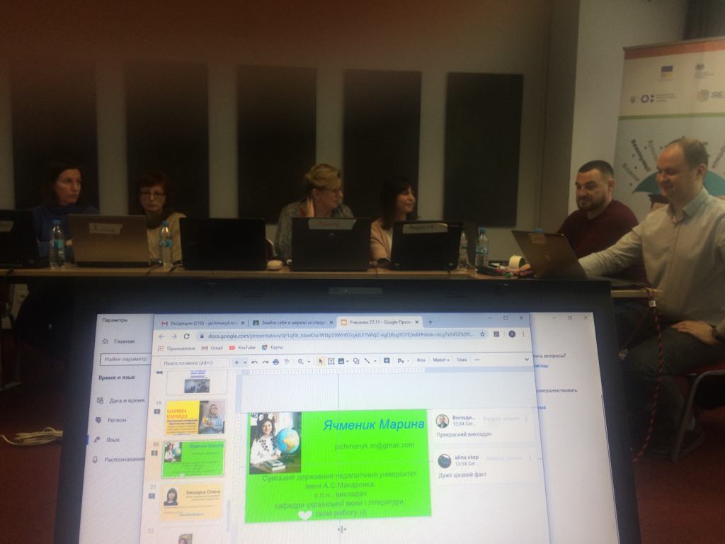 25-28 листопада 2019 року авторська група викладачів факультету іноземної та слов'янської філології Сумського державного педагогічного університету імені А.С. Макаренка (заступник декана ФІСФ, к.ф.н., доцент Кириленко Н.І., завідувачка кафедри української мови і літератури, д.п.н., професор Семеног О.М., к.ф.н. доцент Герман В.В., к.п.н., доцент Громова Н.В., аспірантка кафедри української мови і літератури Пономаренко Н.П., к.п.н., викладач Ячменик М.М.) відвідали тренінги з медійної грамотності «Діалогова комунікація як складова освітнього процесу» та «Інструменти онлайнового навчання», що відбулися у межах ґрантового проекту «Вивчай і розрізняй: інфомедійна грамотність (компонент для закладів вищої освіти та ІППО)», який виконується за підтримки посольств США та Великої Британії, у партнерстві з Міністерством освіти і науки України та Академією Української Преси.